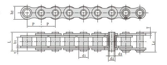 鏈號 節(jié)距 套筒直徑 內(nèi)節(jié)內(nèi)寬 銷軸直徑 銷軸長度 內(nèi)鏈板高度 鏈板厚度 破斷載荷 每米長重