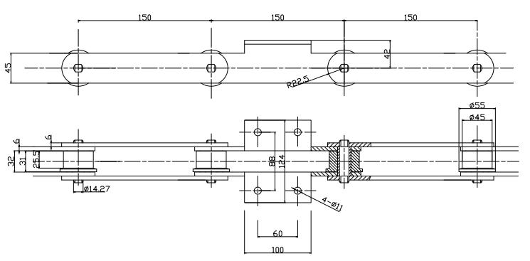 輸送鏈條,節距為150mm,帶托板附件,滾軸為F輪,應用于多種輸送設備上,上圖主要為輪轂輸送線