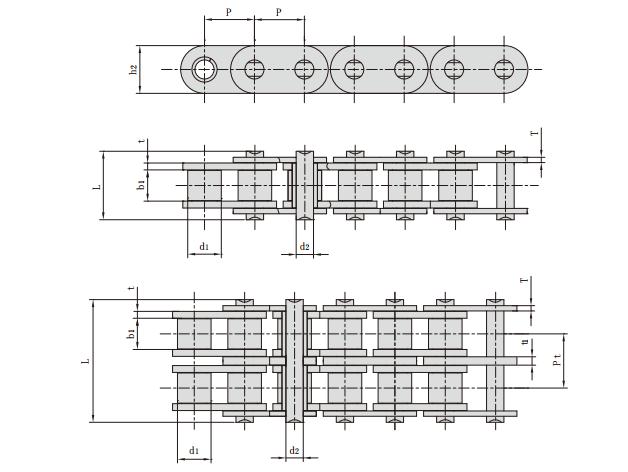 主要型號有:節距,滾子直徑,內節內寬,銷軸直徑,銷軸長度,內鏈板高度,鏈板厚度,排距,抗拉強度,每米長重
