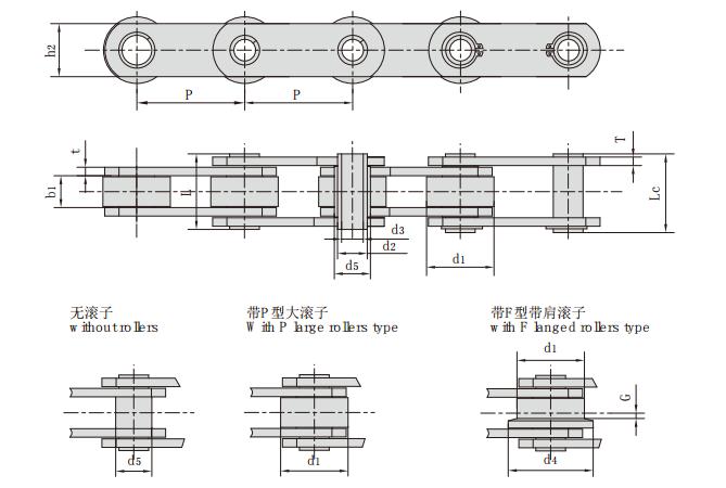 | 鏈號(hào) | 節(jié)距 | 滾子尺寸 | 套筒直徑 | 內(nèi)節(jié)內(nèi)寬 | 銷軸直徑 | 鏈板高度 | 銷軸長度 | 鏈板厚度 | 抗拉強(qiáng)度 | |||||||||